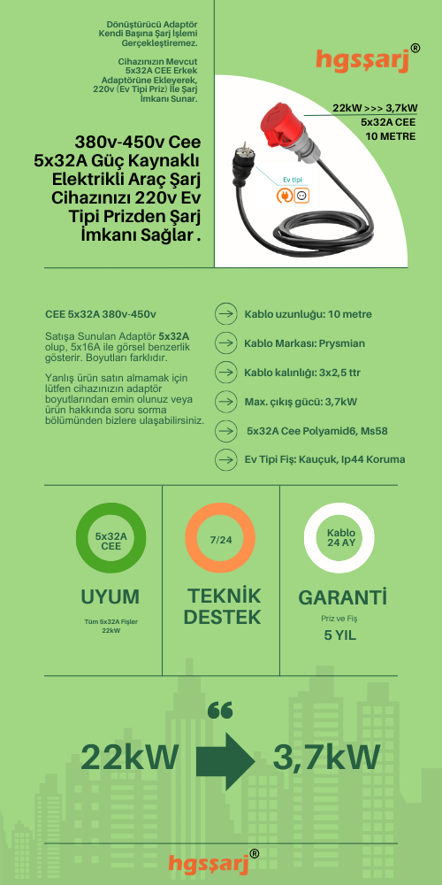 Hgsşarj, 5m, 10m, 15m, 20m - 5x32A 380V-450V ile Çalışan Cihazınızı, 220V Ev Tipi Prize Bağlamayı Sağlar. 5x32A Fiş Olan Tüm Cihazlarda Kullanılabilir. Cihazınıza Uygun Adaptörleri Dakikalar içinde Whatsapp Hattımızdan Öğrenin. Teknik Destek 0530 9715215