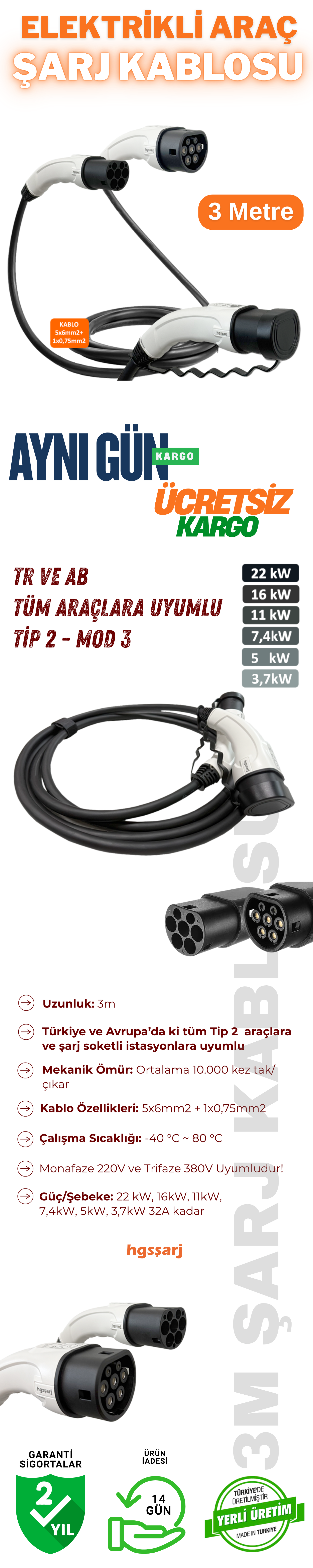Hgsşarj 3 Metre, Elektrikli Araç Şarj Kablosu 22kW-16kW-11kW-7,4kW-5kW-3,7kW 32A Kadar -TR-AB Tüm Tip 2 Araçlara Uyumlu